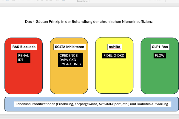 Das 4-Säulen-Prinzip in der Behandlung der chronischen Niereninsuffizienz: Fortschritt durch gezielte Pharmakotherapie Die chronische Niereninsuffizienz (CKD) ist eine progressive Erkrankung, die häufig mit Diabetes mellitus Typ 2 und kardiovaskulären Begleiterkrankungen vergesellschaftet ist. In den letzten Jahren hat sich das Verständnis der Pathophysiologie deutlich erweitert – und damit auch die therapeutischen Möglichkeiten. Die moderne Pharmakotherapie basiert zunehmend auf einem 4-Säulen-Prinzip, das auf synergistisch wirkende Substanzklassen setzt, um sowohl die Progression der Nierenerkrankung zu bremsen als auch das kardiovaskuläre Risiko zu senken.